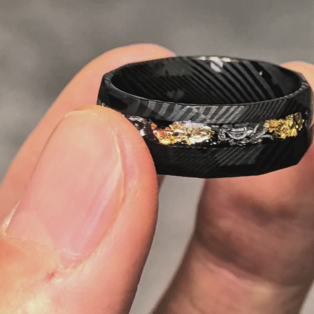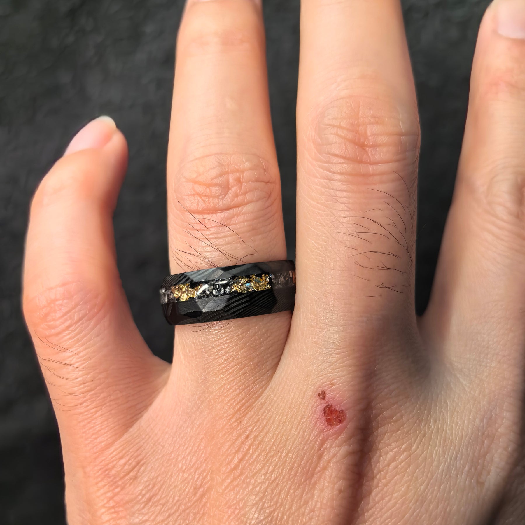 This black ring is something that we are so proud of. This is a Hammered Damascus steel ring with amazing twists, and 4 billion-year-old Gibeon meteorite, and gold leaf inlay. The combination of gold leaf and meteorite fragments makes this ring look noble and mysterious.