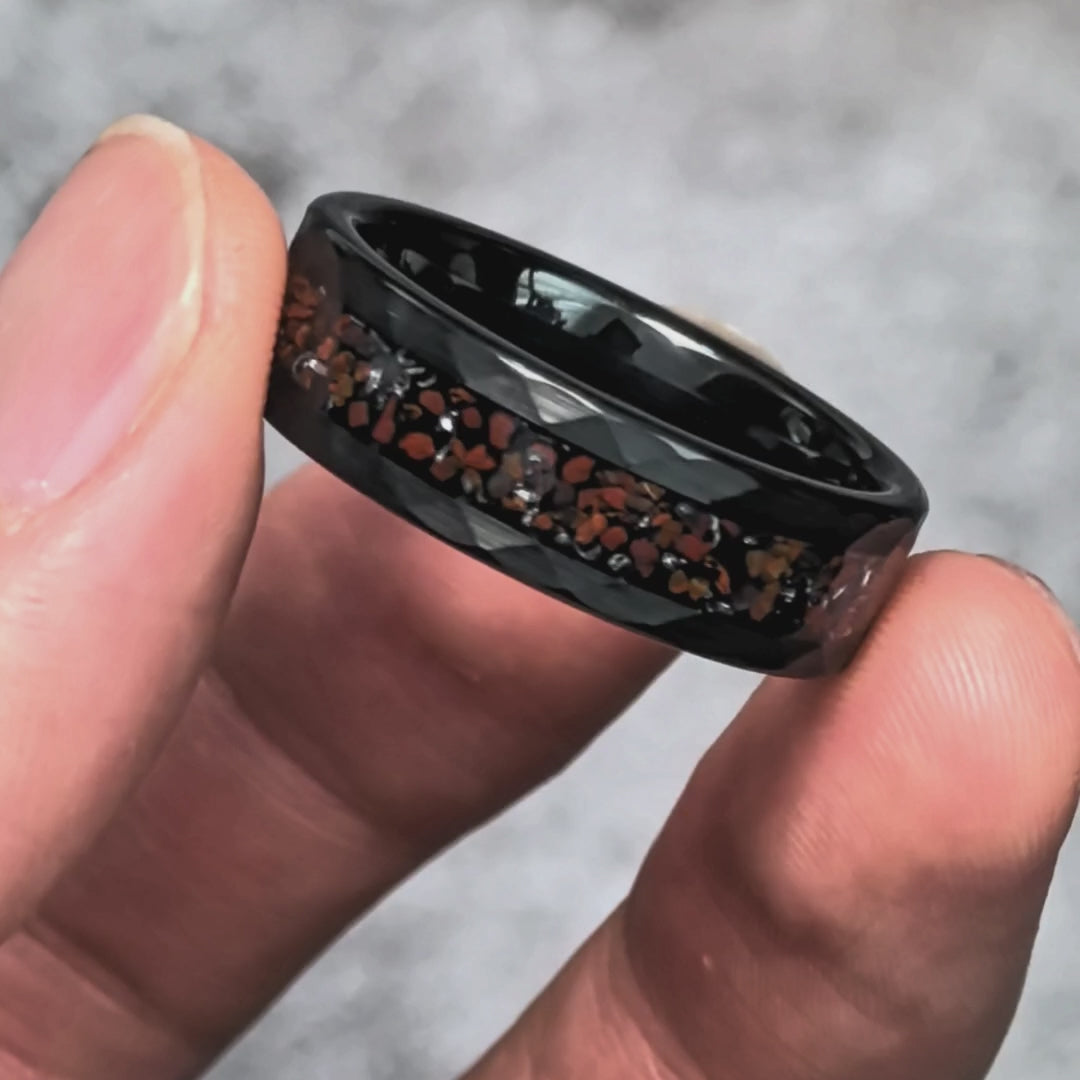 The meteorite fragments in this wedding ring are the Gibone Meteorite, a prehistoric meteorite that fell in Namibia, South Africa. It was named after the nearest town it landed in: Gibeon. Meteorites get their name because they come from outer space and are fragments of asteroids and comets! The meteorite has gone through four ice ages since it landed on Earth. This is by far the oldest mosaic material we have ever used, as meteorite fragments are about 4 billion years old.
