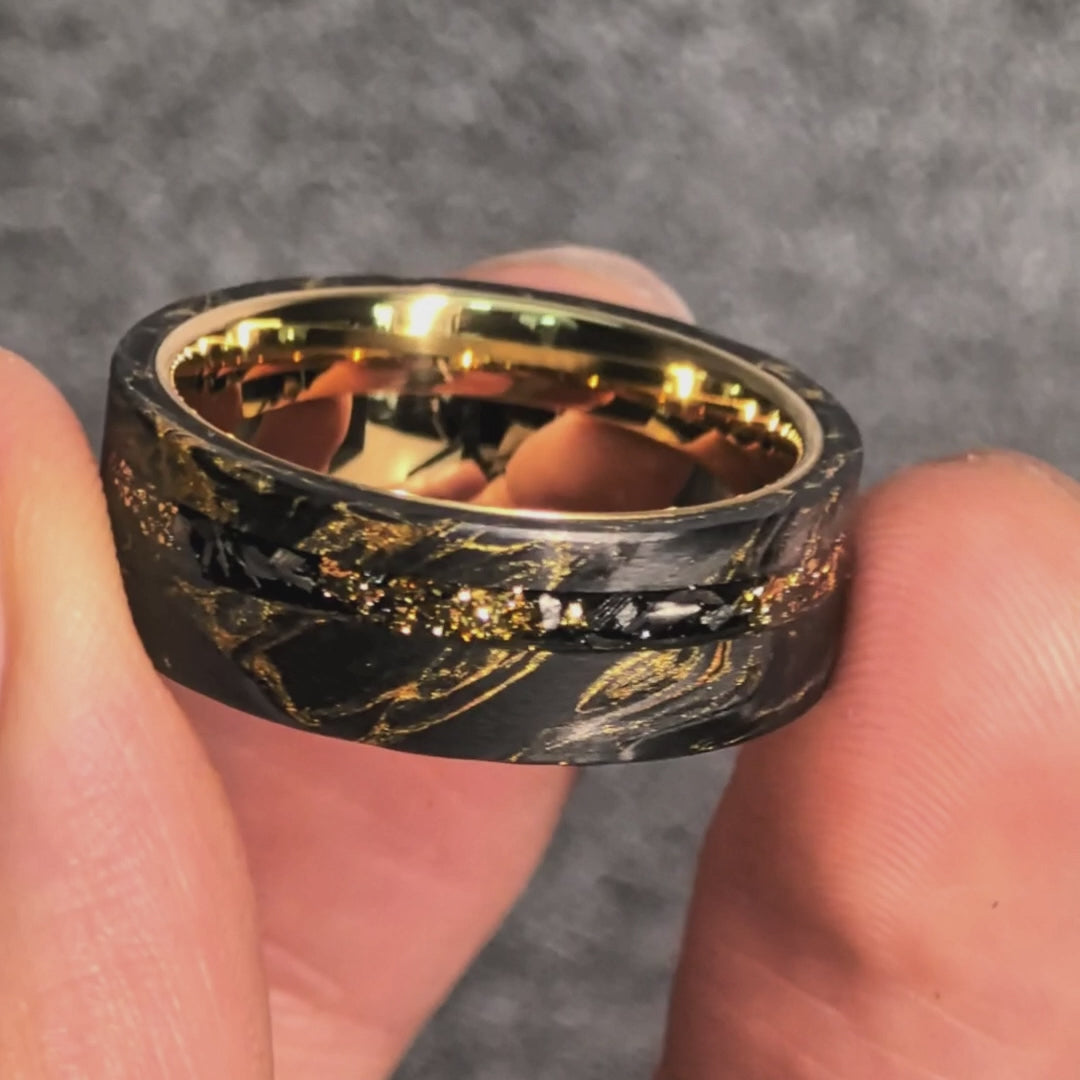This black forged carbon fiber ring with mixed gold foil is one of the rings we are very proud to design and make. The uniqueness of this ring lies in these amazing golden swirl patterns, which are forged by mixing black forged carbon fiber and gold foil through a special process. The golden swirl pattern is formed randomly, no two rings are the same, so each ring is completely unique and has its own fingerprint. The black forged carbon fiber ring with mixed gold foil is inlaid with Muonionalusta meteorite and 22k gold foil, and the gold foil and meteorite fragments are perfectly combined to give this ring a noble and mysterious look! The inner sleeve is designed with polished gold tungsten carbide to add nobility and comfort!