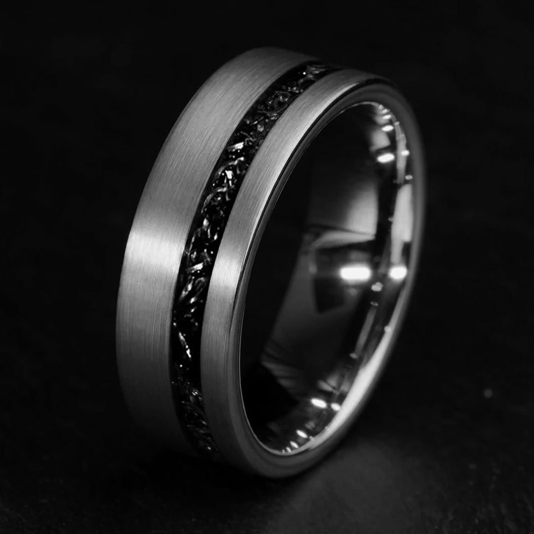 We exclusively use authentic meteorites in every meteorite ring. The Meteorite chips are milled out of a large block of Gibeon meteorite and then set for the inlay. It creates an entirely unique aesthetic.