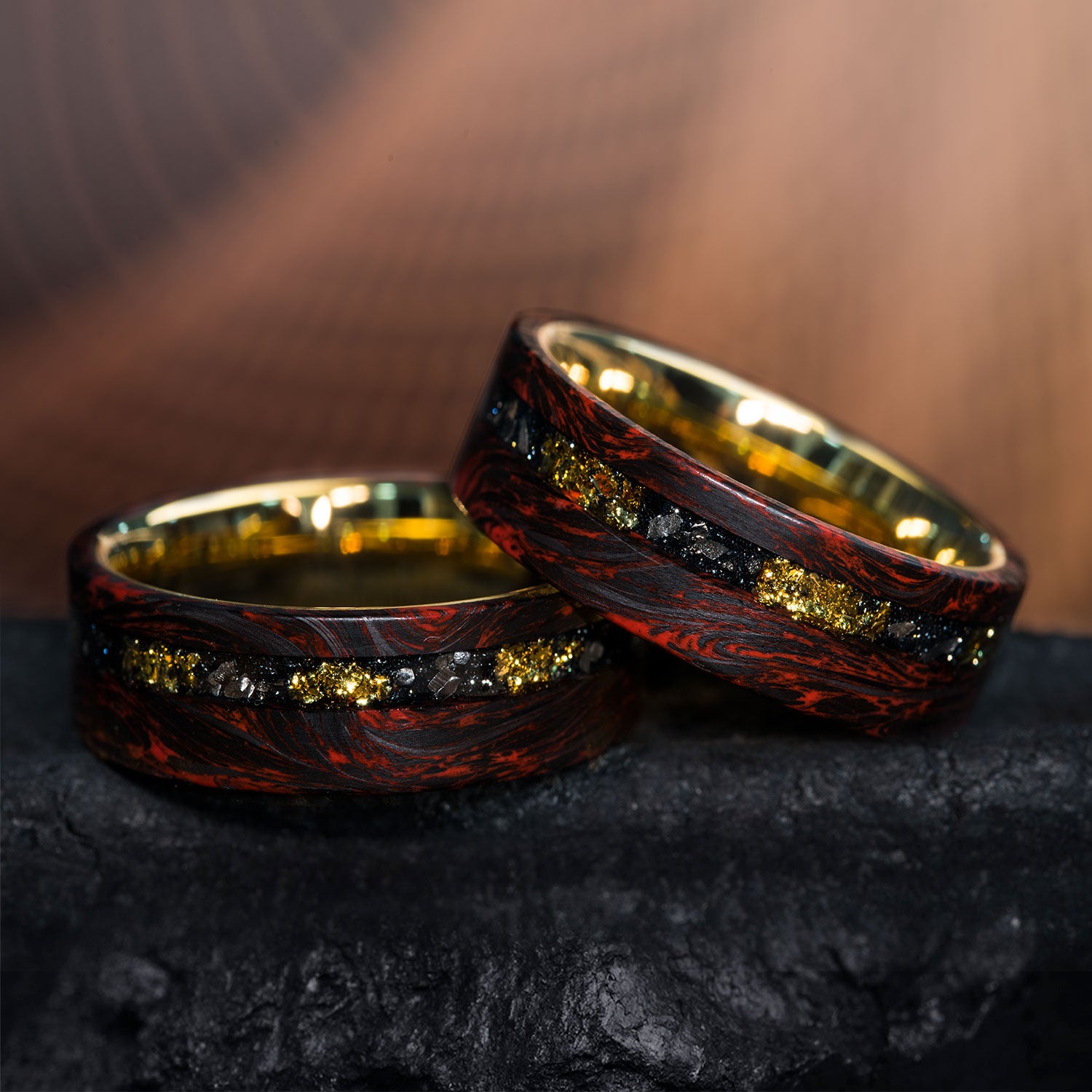 Introducing THE CRIMSON FLAME, a truly unique ring born from a fusion of advanced engineering and materials sourced from the edge of the universe. This 8mm band is more than jewelry; it is a powerful, lightweight talisman that symbolizes passion, enduring strength, and an unbreakable spirit.