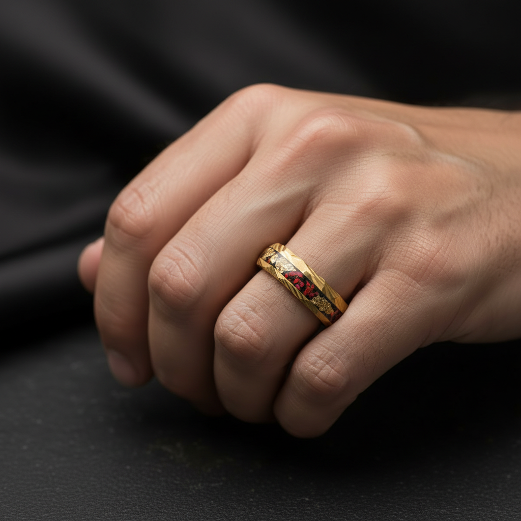 Transform your wedding band into a symbol of power and magic with The Red Planet. The stunning combination of golden hammered Damascus steel, gold leaf, and fire opal reflects an air of nobility and mystery. Embrace your risk-taking spirit and make a bold statement with this one-of-a-kind ring.