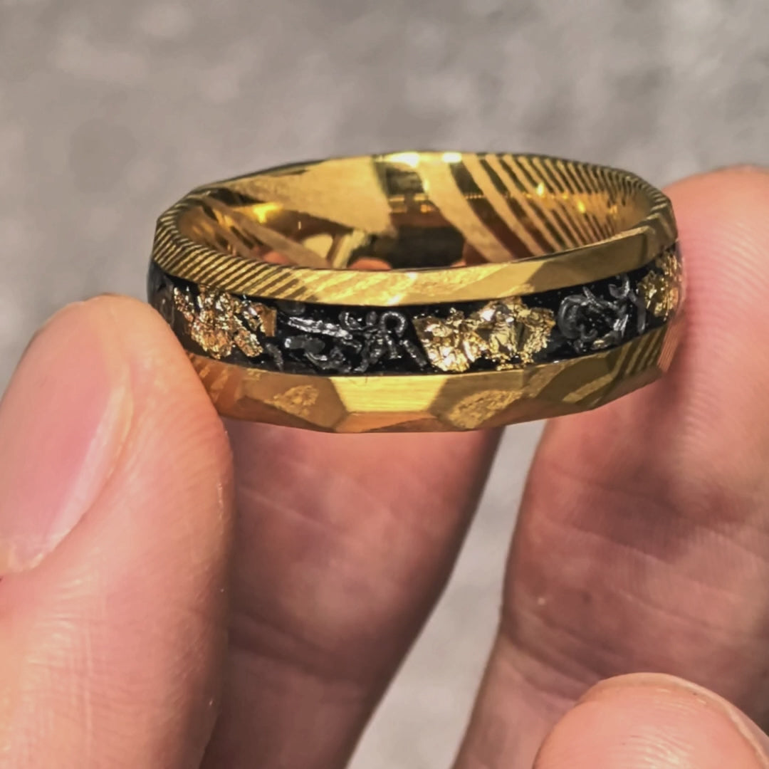 This gold Damascus steel ring is something that we are so proud of. This is a Hammered Gold Damascus steel ring with amazing twists, and 4 billion-year-old Gibeon meteorite, and gold leaf inlay. The combination of gold leaf and meteorite fragments makes this ring look noble and mysterious.