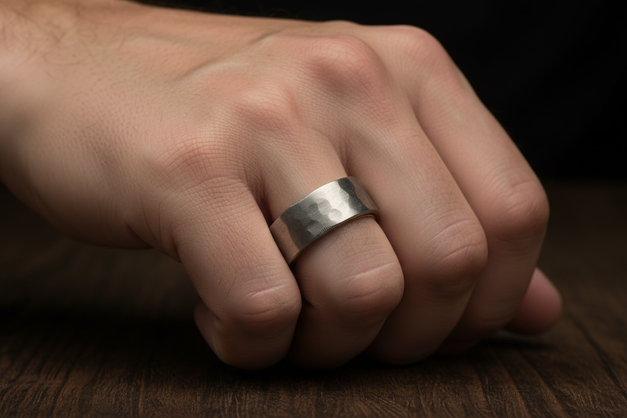 All titanium rings with inlays are sealed with titanium aerospace adhesive, and each ring is sealed on a glossy waterproof surface. Finally, the ring is polished with beeswax.