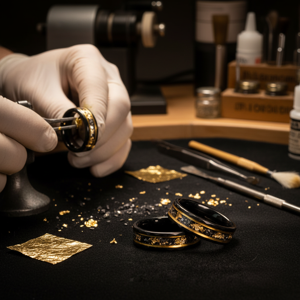 This gold foil meteorite ring is one of our very proud collections of rings. This black hammered ring with 2 gold bars is set with the Muonionalusta meteorite and 22k gold leaf, the gold leaf and meteorite fragments combine perfectly to give this ring a noble and mysterious look! Making a ring from a 4 billion-year-oldmaterial is very exciting for us and we hope you enjoy them too!