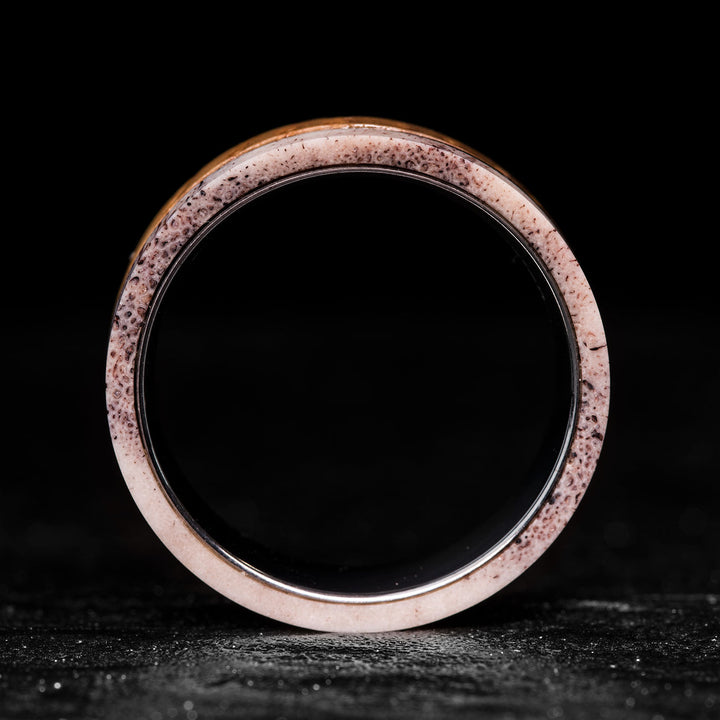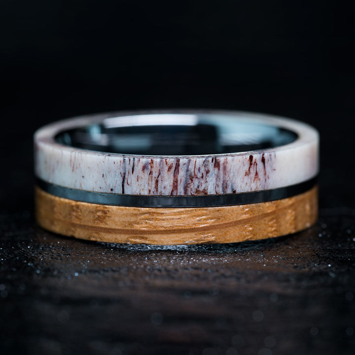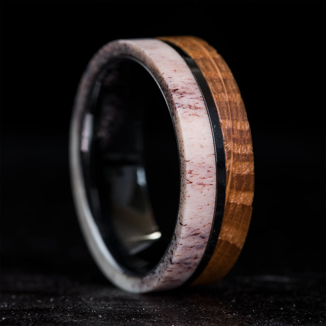 This unique wedding ring showcases a love for outdoor activities, combining antlers and whiskey barrel materials. The silver titanium pinstripe accents the two different materials, while the masculine whisky barrel wood rim complements naturally falling antlers, resulting in a sophisticated and fashionable design. This ring makes for a stunning gift no matter the occasion.
