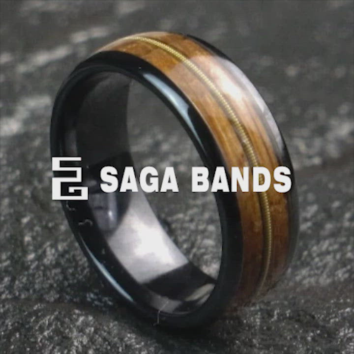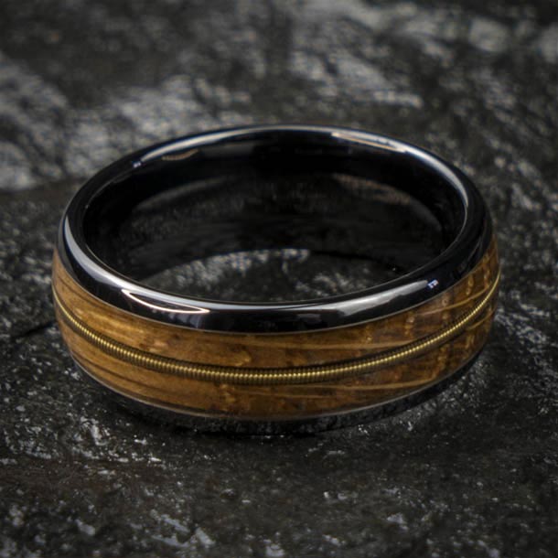 This black ceramic ring with whiskey barrel wood and guitar string, Whiskey barrel wood ring is cut from an old Jack Daniels whiskey barrel and is inlaid with guitar strings. This is a handmade whiskey barrel wood ring and gave him a ring he would wear proudly!