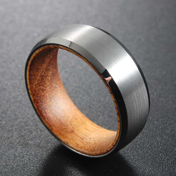 This silver tungsten band features a stylish exterior and a unique inner wood lining for optimal comfort. With its all-metal appearance and wooden fit, it is the ideal choice for daily wear to symbolize your commitment.